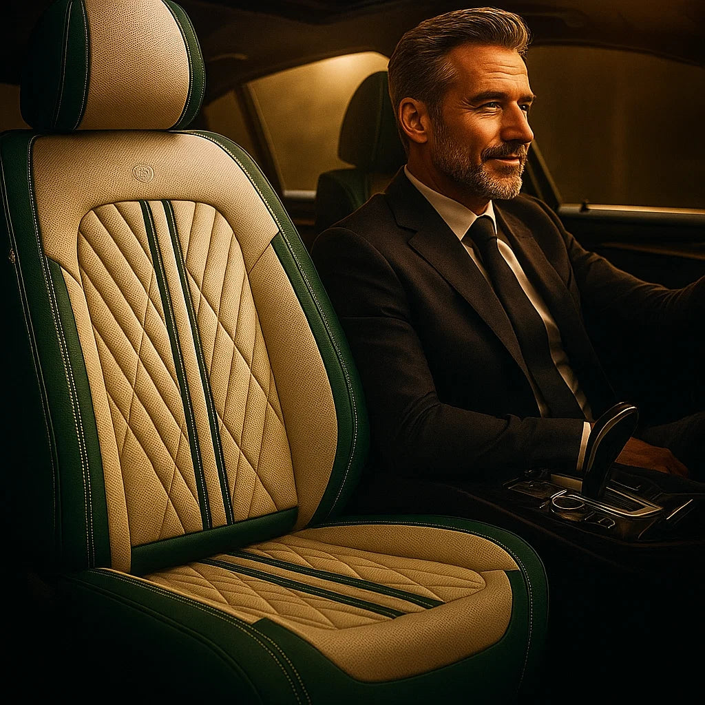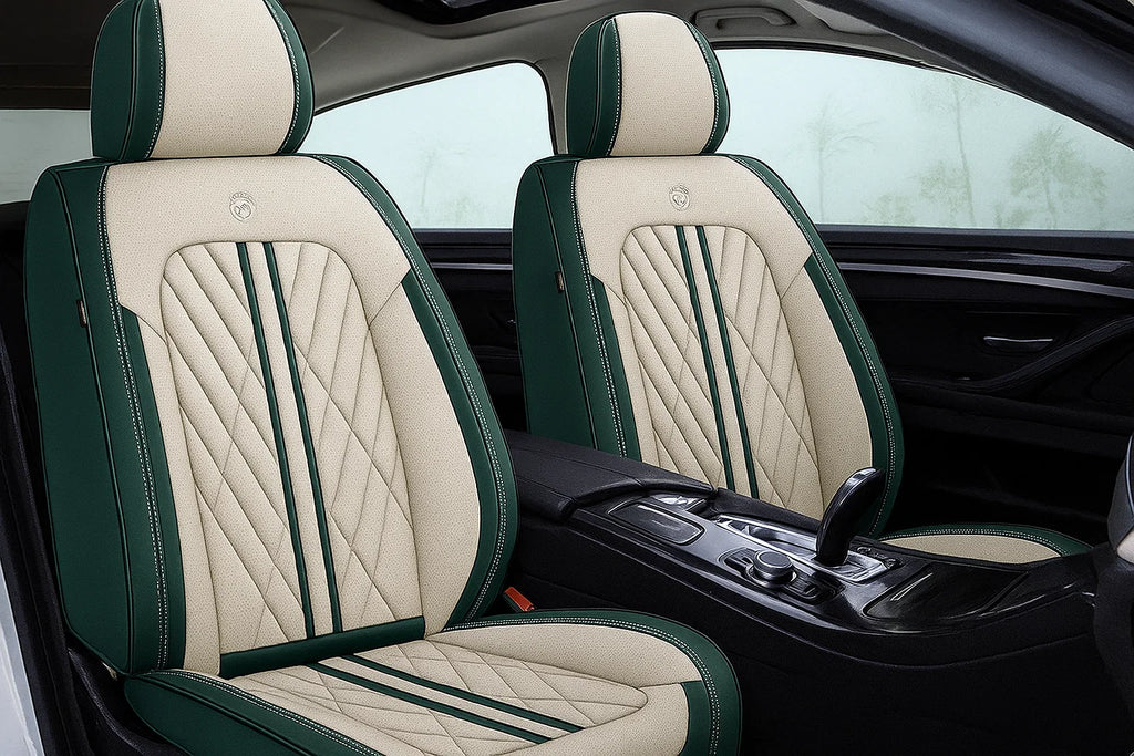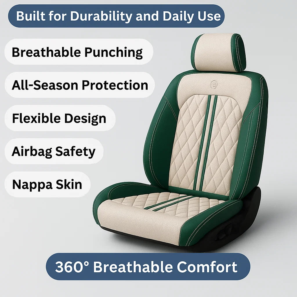 Premium Beige & Green custom car seat cover featuring elegant diamond stitching and contrast piping, designed for a sleek, custom fit. It adds a refined, luxurious touch to your vehicle's interior while providing lasting durability and style.