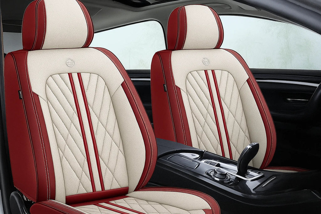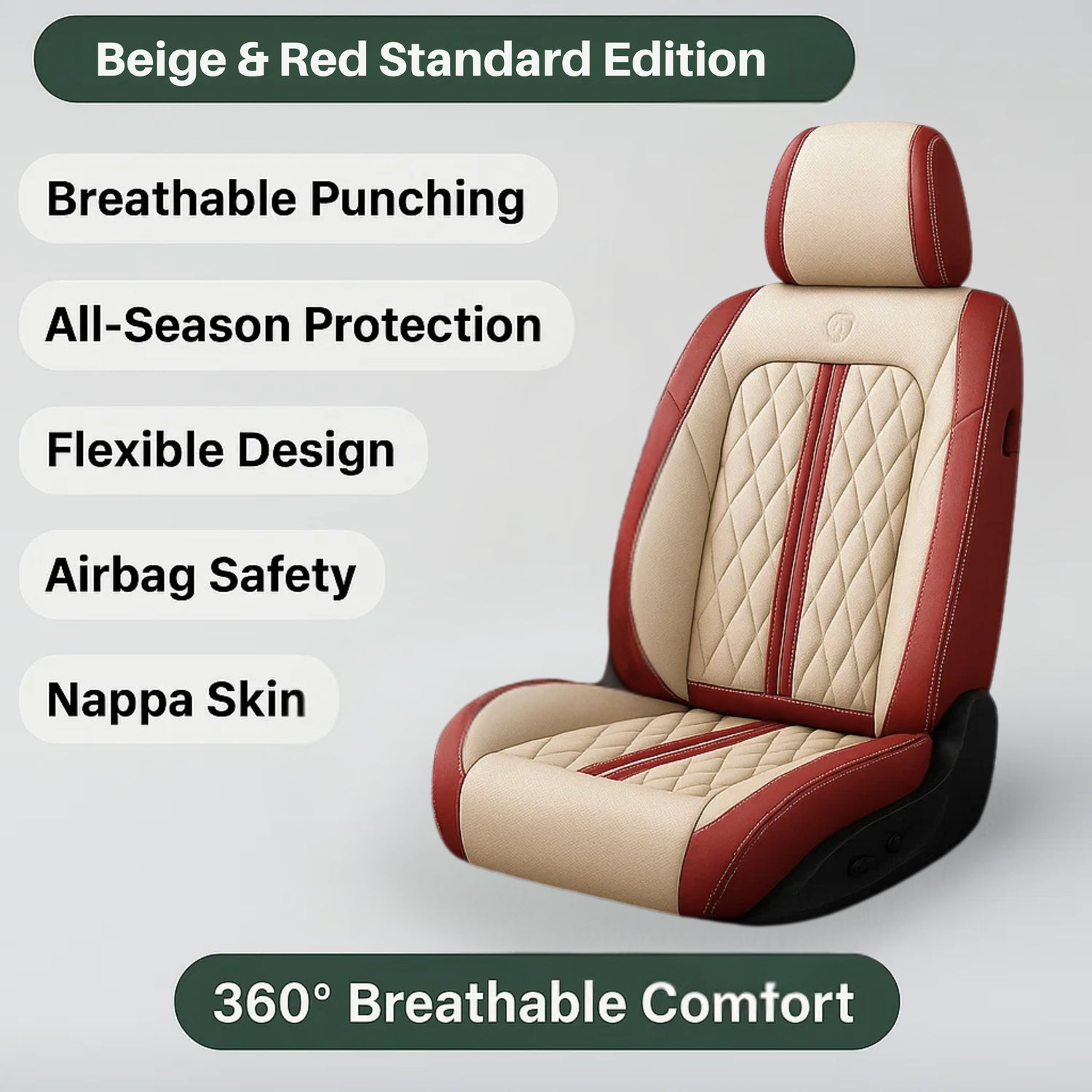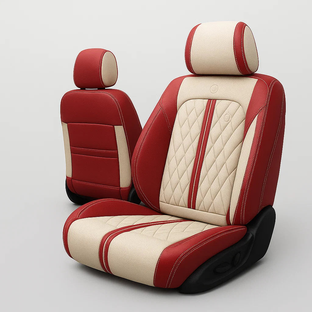Premium Beige & Red custom car seat cover featuring elegant diamond stitching and contrast piping, designed for a sleek, custom fit. It adds a refined, luxurious touch to your vehicle's interior while providing lasting durability and style.