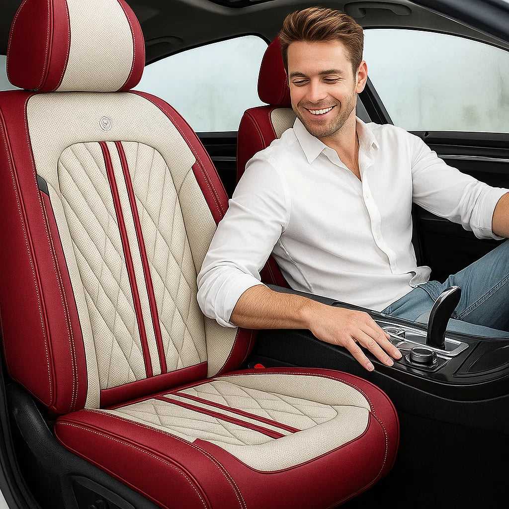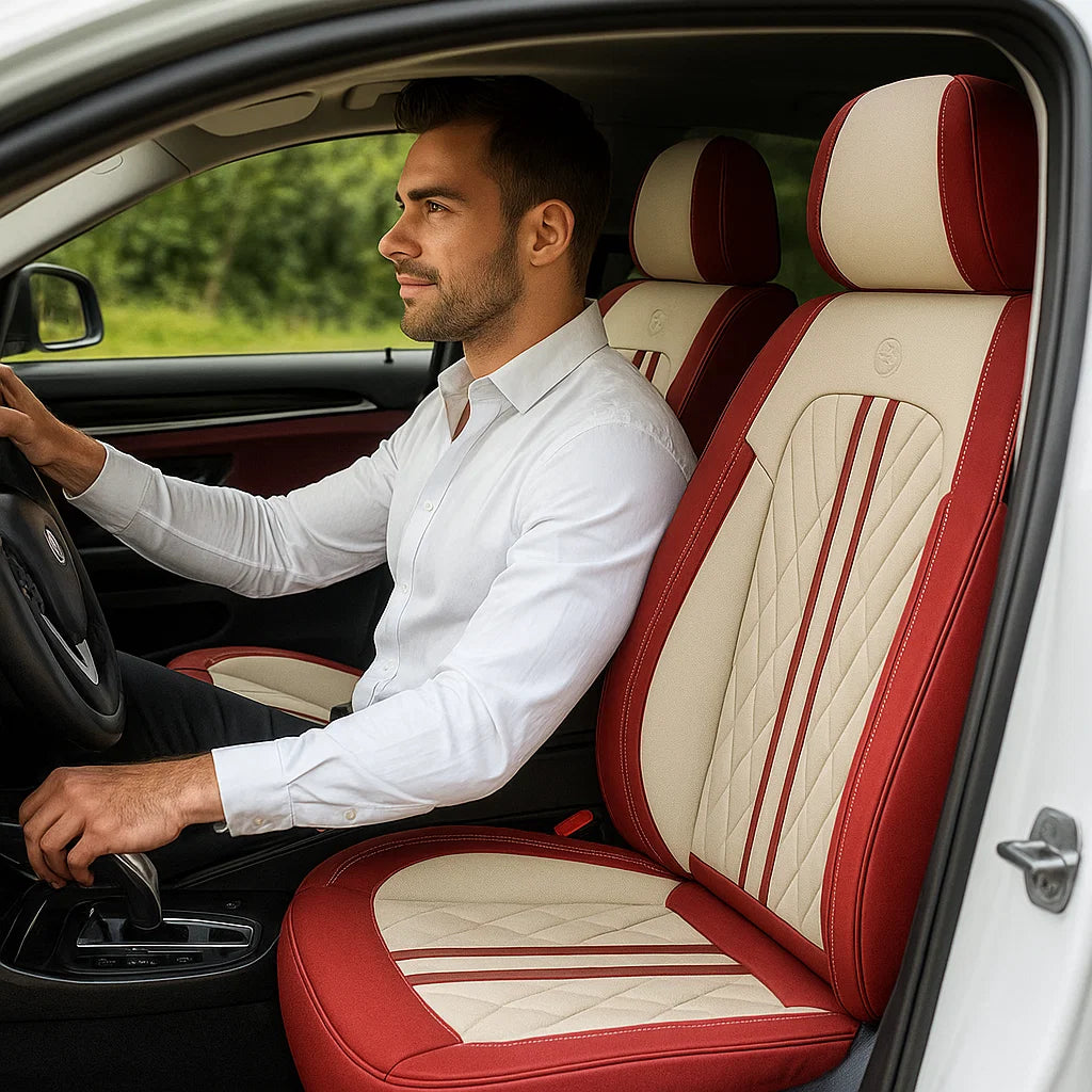 Enhance your car’s interior with our beige and red custom car seat covers. Designed for a perfect fit, these covers offer superior protection and a stylish contrast that elevates your vehicle’s look while ensuring comfort and durability.