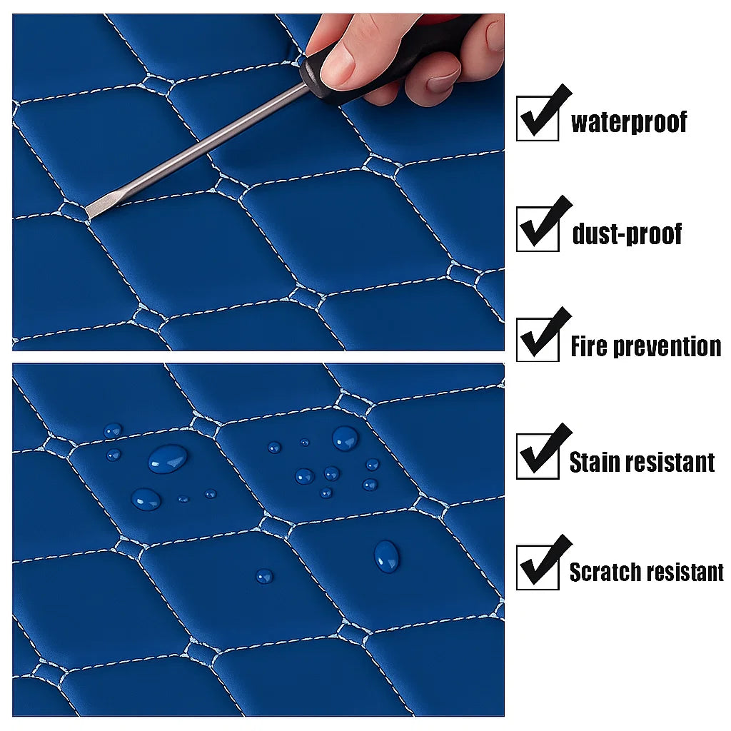 Designed for the bold driver, these mats offer fire resistance, stain resistance, and waterproof protection, all wrapped in a sleek diamond-stitched blue design.