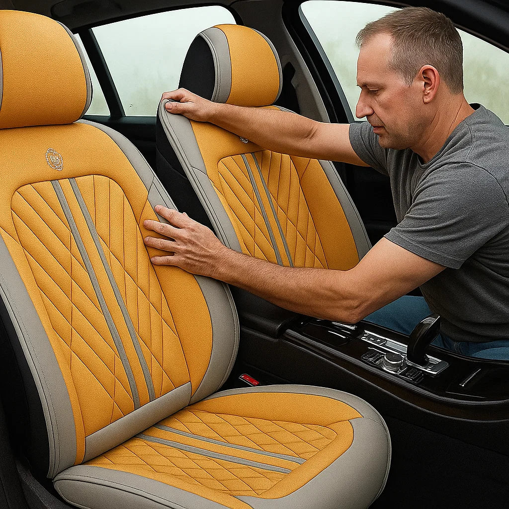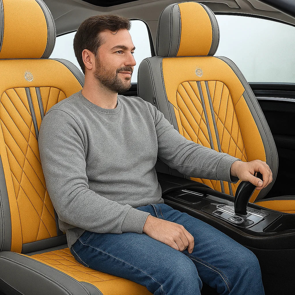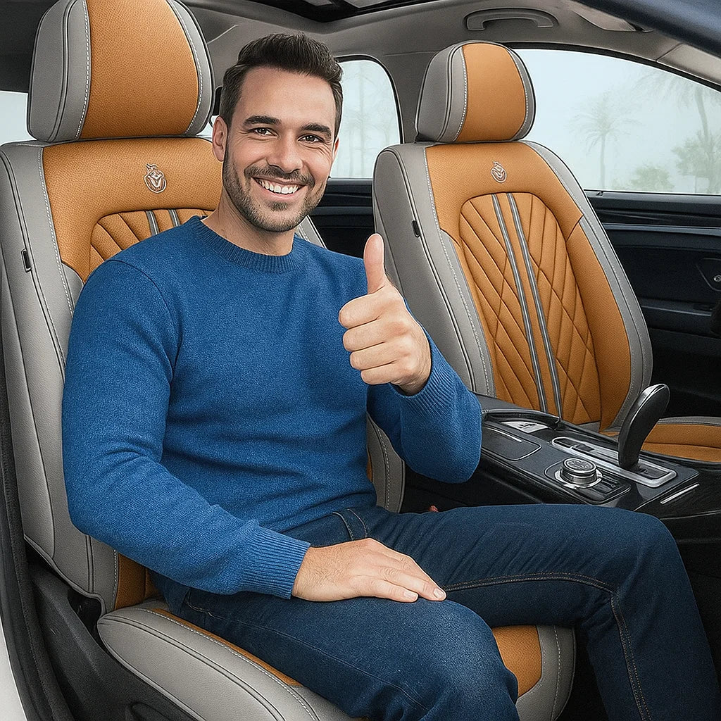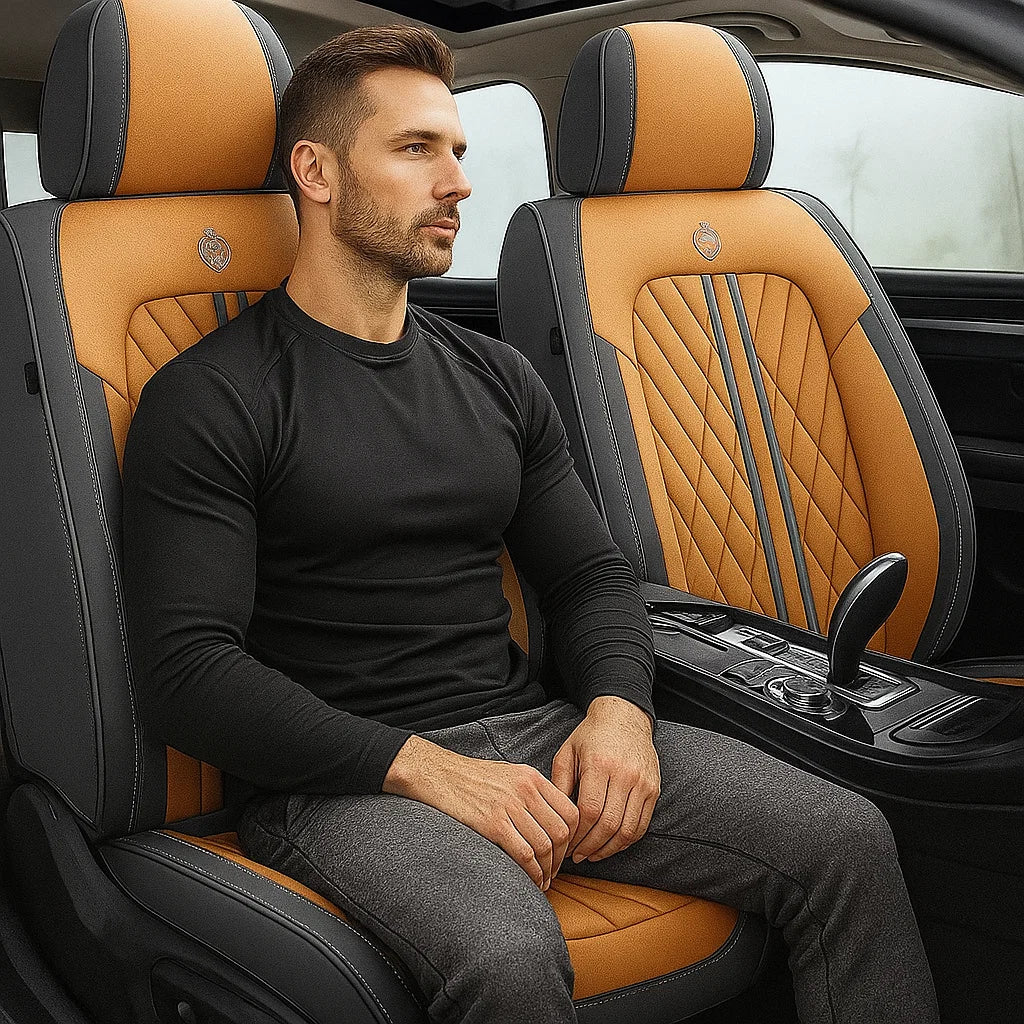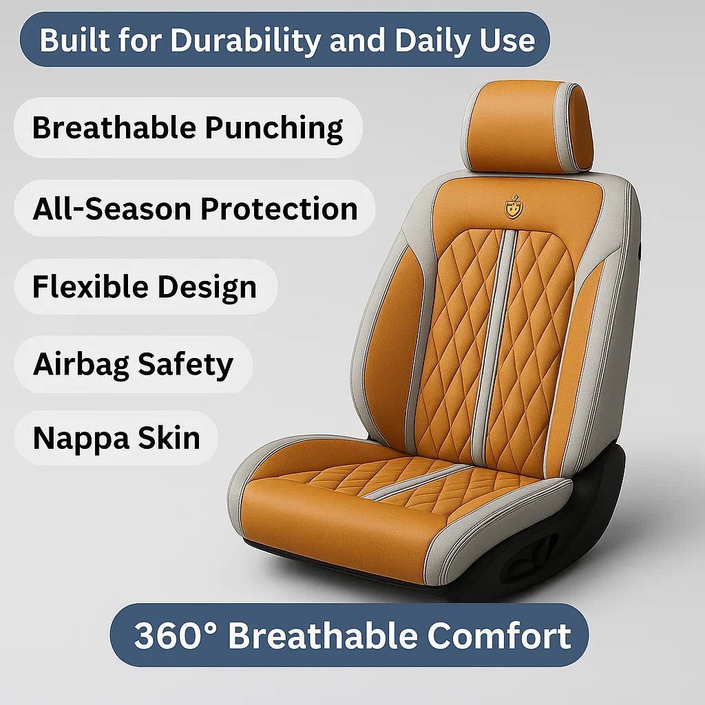 Experience full seat coverage with breathable Nappa skin, a snug headrest fit, and built-in storage. Airbag-safe wings and scratch-resistant material make it both stylish and practical.