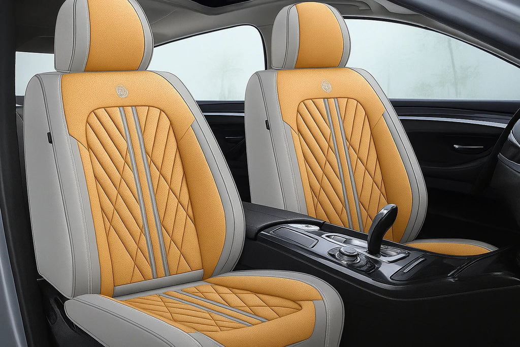 Enhance your car's interior with our Brown & Gray Custom Car Seat Covers Set. Designed for a perfect fit, these seat covers offer premium protection while adding a sophisticated touch to your vehicle with a stylish blend of brown and gray.