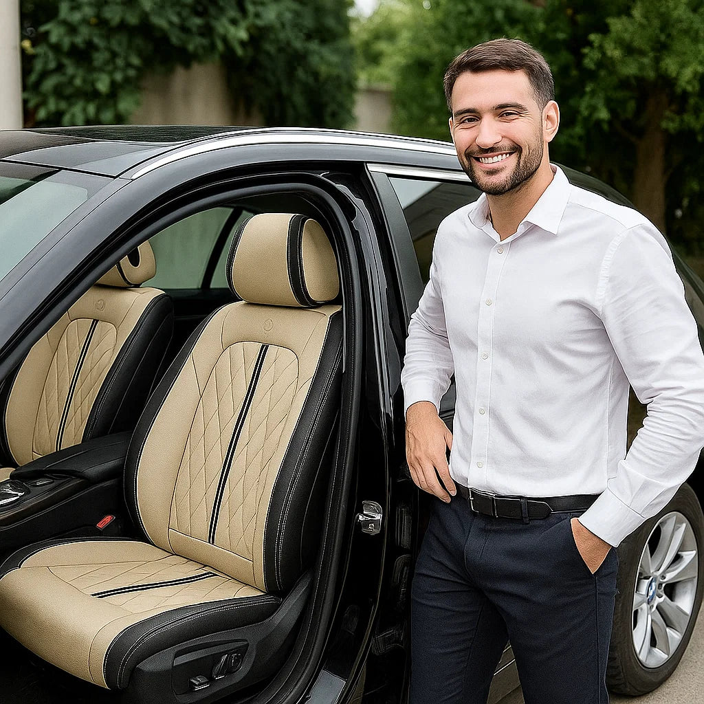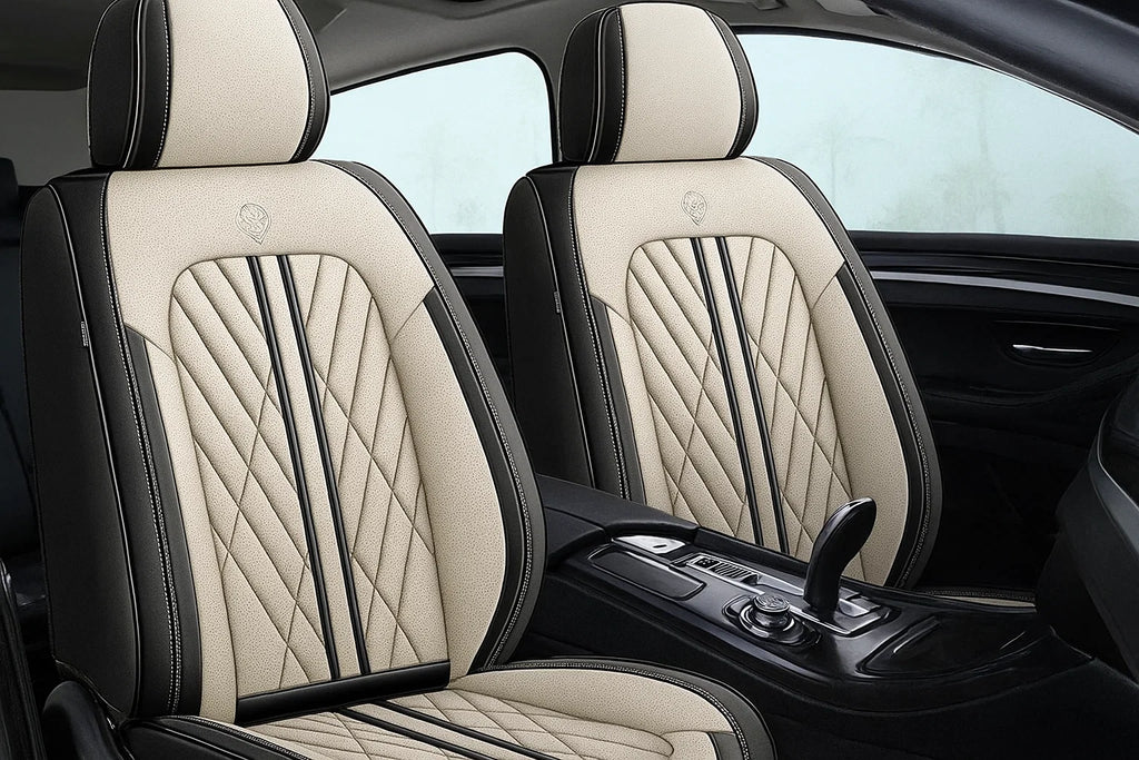 Custom Beige & Black Car Seat Covers combine sleek style with durable protection. Crafted from premium PU leather, these covers offer a perfect fit, protecting your seats from spills, stains, and wear. The elegant beige and black design elevates your car’s interior while providing all-season comfort and easy maintenance.