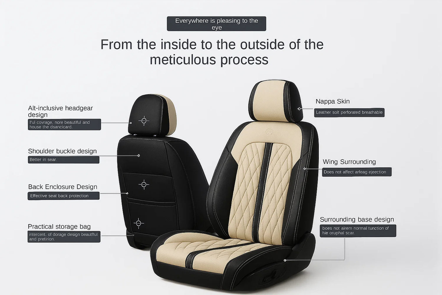 This Beige & Black Car Seat Cover features Nappa skin for durability, breathable material, and full headgear coverage. With a shoulder buckle design for better fit, back enclosure for added protection, and wing surrounding ensuring airbag safety, it blends comfort and style effortlessly.