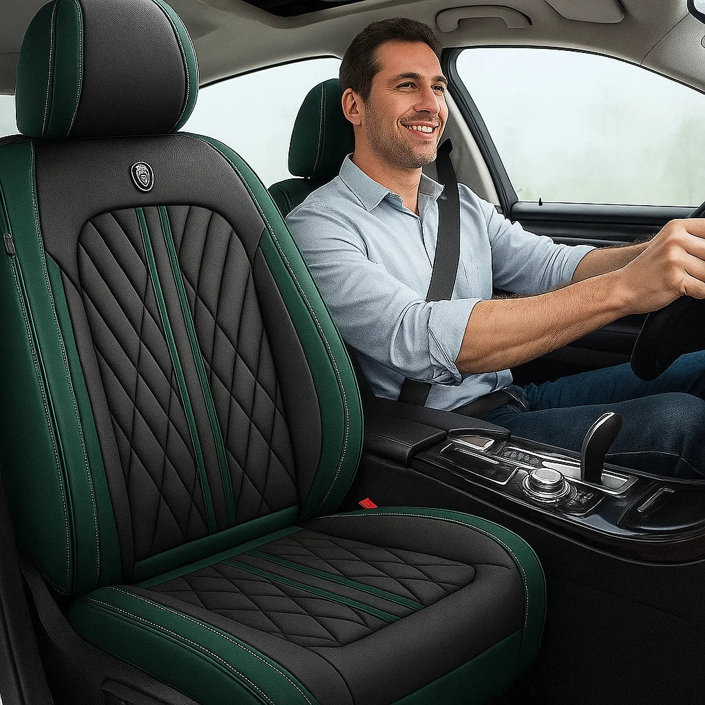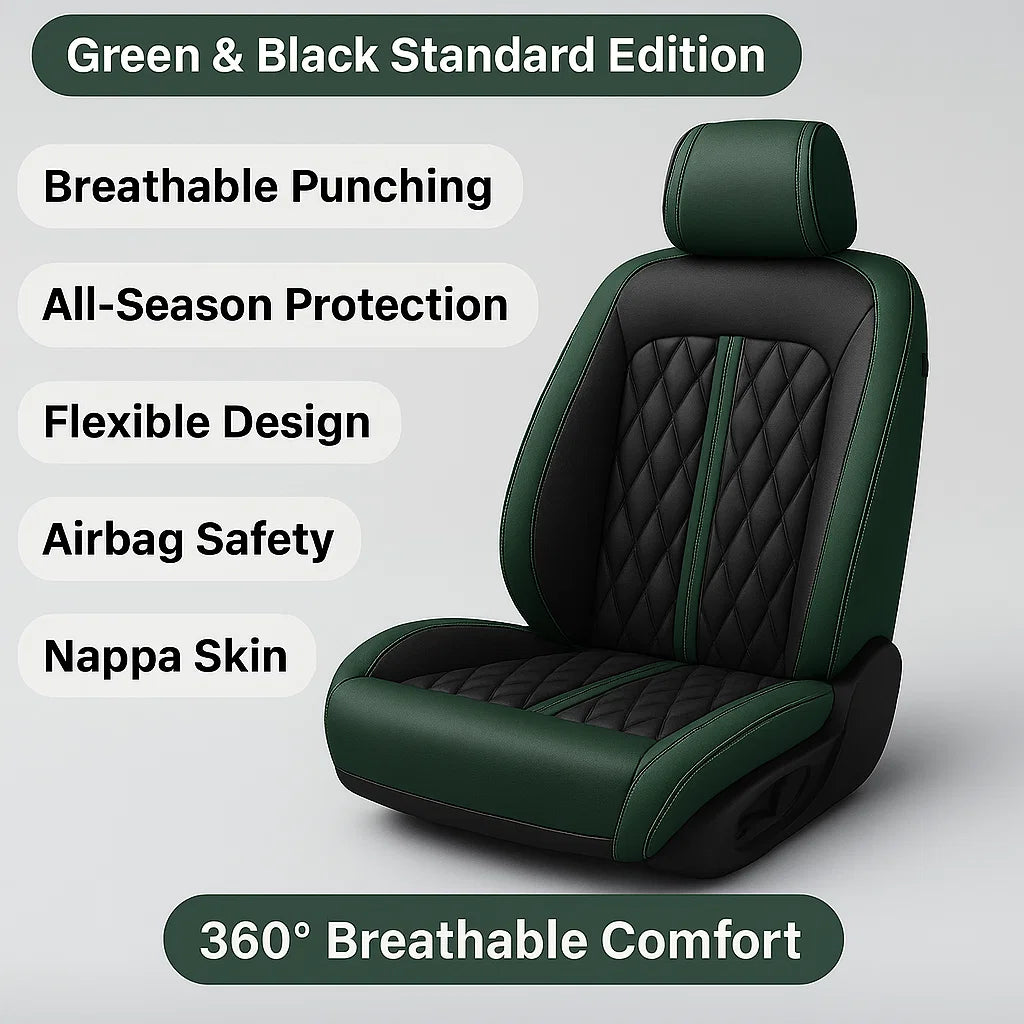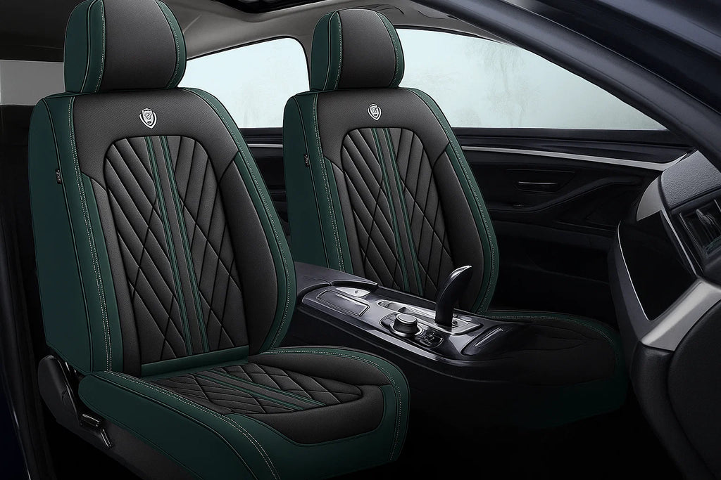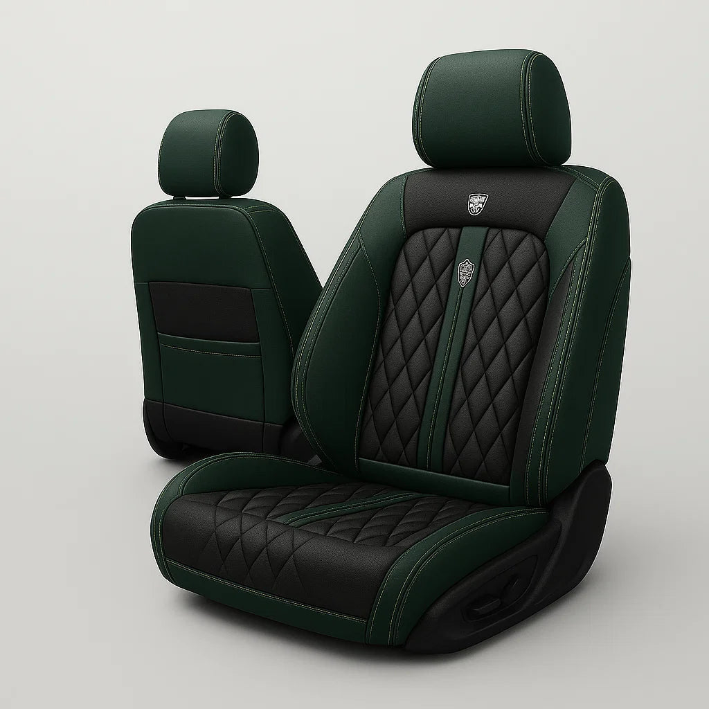 Premium Green & Black seat cover featuring elegant diamond stitching and contrast piping, designed for a sleek, custom fit and a refined, luxurious upgrade to any car interior.