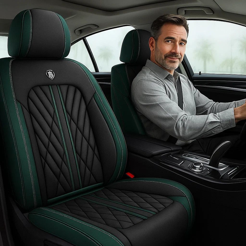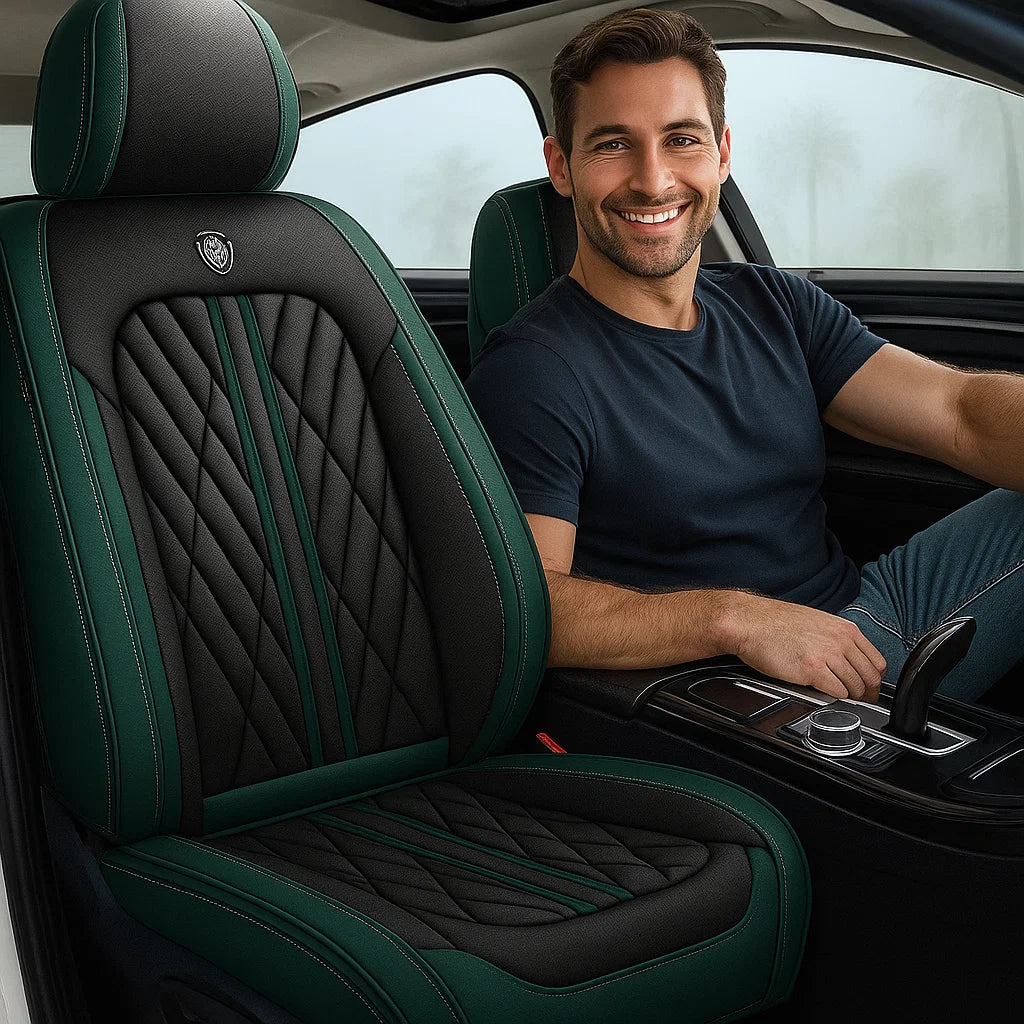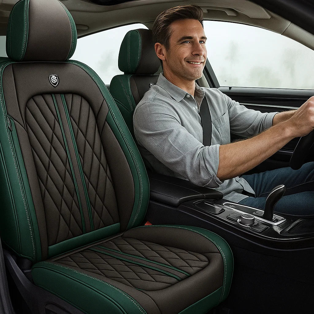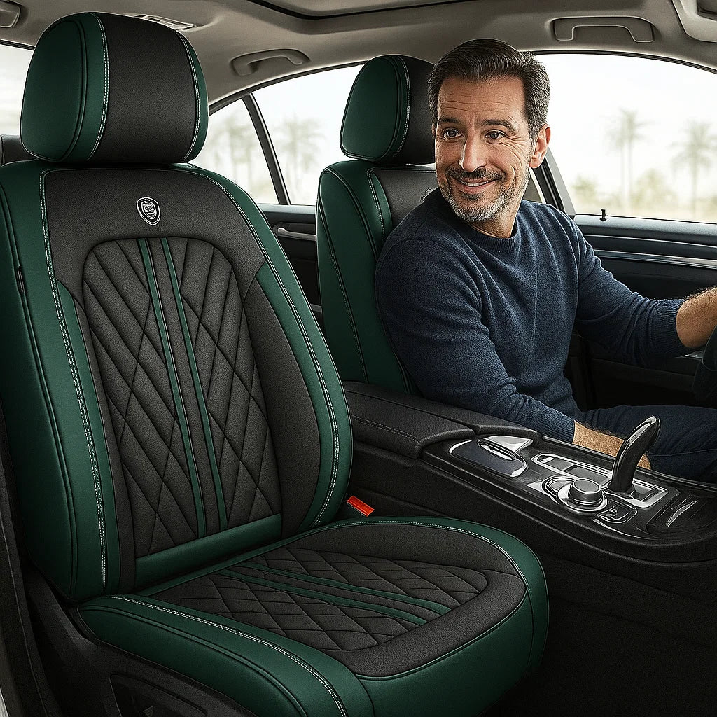 Premium Green & Black seat cover featuring elegant diamond stitching and contrast piping, designed for a sleek, custom fit and a refined, luxurious upgrade to any car interior.