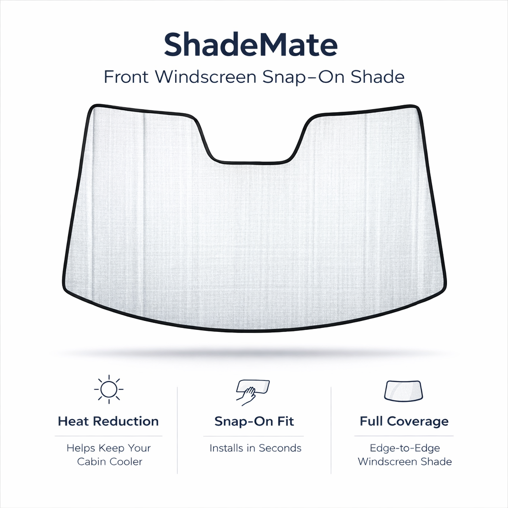 ShadeMate’s front windscreen cover snaps on in seconds and delivers full, edge-to-edge coverage for a clean fit that stays put—helping cut glare and protect your dash from harsh UV.