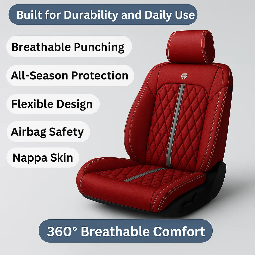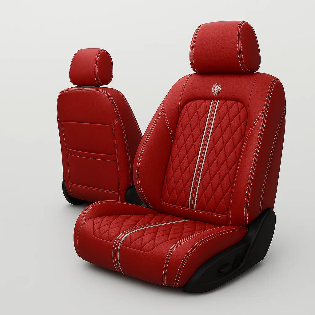 Premium Wine Red seat cover featuring elegant diamond stitching and contrast piping, crafted for a sleek, custom fit that adds a refined, luxurious touch to any car interior.